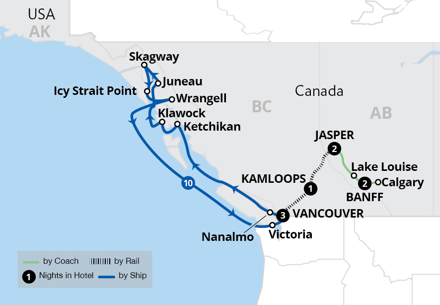 On this once-in-a-lifetime tour you'll begin by exploring the alpine resort towns of Banff, Lake Louise, and Jasper, before boarding VIA Rail's Canadian train for a trip through the Canadian Rockies to Vancouver. After exploring the exciting city of Vancouver, you'll swap the rails for the waterways when you board your cruise ship to take you...