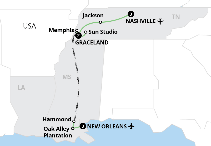 Explore Nashville, Memphis and New Orleans' links to iconic musicians, embracing the heartlands of country, rock'n'roll and blues before travelling through Mississippi by rail to uncover the birthplace of jazz. During this musical journey, step into the world of Elvis Presley at his Graceland home, spend an evening at the Grand Ole Opry, where...