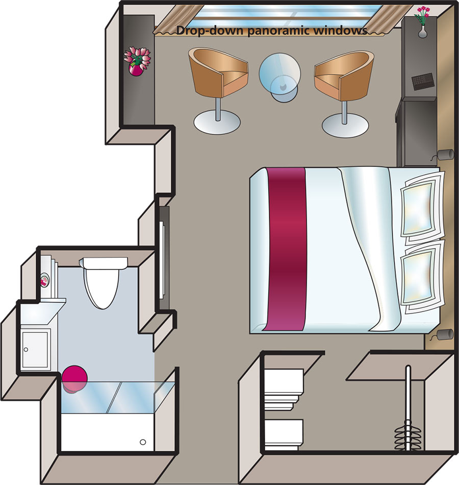 These en-suite cabins are stylish and impressively spacious at 17.5 squre metres, with a panoramic window balcony, walk-in wardrobe and seating area.