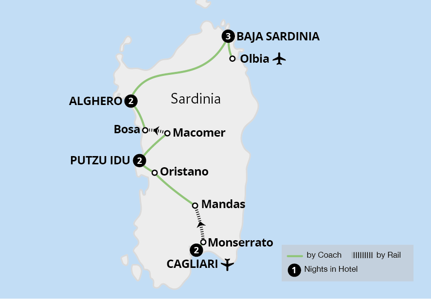 Your holiday begins at London Gatwick where we meet the Tour Manager before flying directly to Sardinia's capital, Cagliari, in the southeast corner of the island. Sardinia is the second-largest island in the Mediterranean after Sicily, located north of Tunisia, south of the French island of Corsica and east of Spain's Catalonia province.